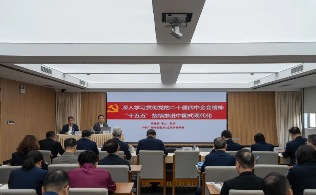 近日,广州城投集团党委召开党委理论学习中心组(扩大)学习暨学习贯彻党的二十届四中全会精神专题研讨班,中共广州市委党校经济学教授、金融学博士吴兆春作全会精神宣贯解读。集团党委中心组成员、总助、本部中层副职以上管理人员、各直属企业领导班子共160余人参加学习。